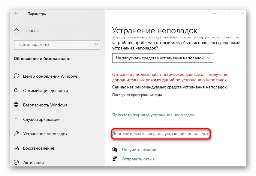 Скорее всего, в главном меню этого окна не будет необходимого средства, поэтому потребуется нажать по кликабельной надписи «Дополнительные средства устранения неполадок».