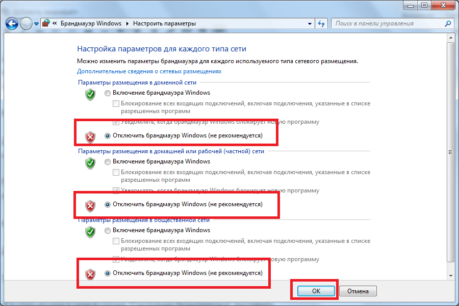 - Выберите и домашнюю и общественную сети и поставьте галочку на пункте «Отключить…».