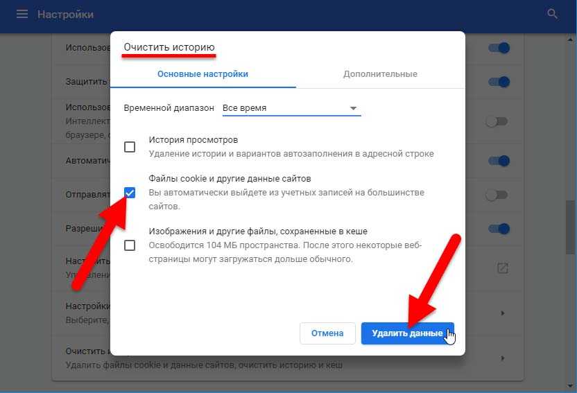 Выберите все 3 пункта: «Удалить историю», «Файлы cookie», «Изображения и другие файлы» и нажмите внизу кнопку «Удалить данные».