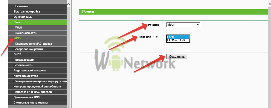Наряду с интернетом, провайдеры предоставляют также и передачу цифрового телевидения, к счастью, WR-740N поддерживает и этот функционал. Заходим в раздел “Сеть” – “IPTV” в списке “Режим” выбираем “Мост” и указываем порт, с которым соединяется кабелем телевизор или приставка. Всего их 4 и они пронумерованы, так что разобраться здесь труда не составит.