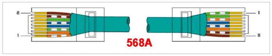 Обе схемы обжима предусматривают расположение проводников на противоположных концевых вилках с учётом соответствия нумерации, когда первый провод располагается напротив восьмого и наоборот – восьмой провод располагается напротив первого.