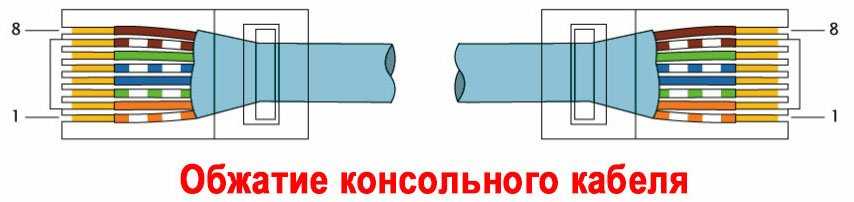 Консольная схема обжима медных жил сетевого кабеля. Отличается тем, что концевые вилки располагаются относительно одна другой обратно перевернутым положением, когда провод 1 = 1; провод 8 = 8