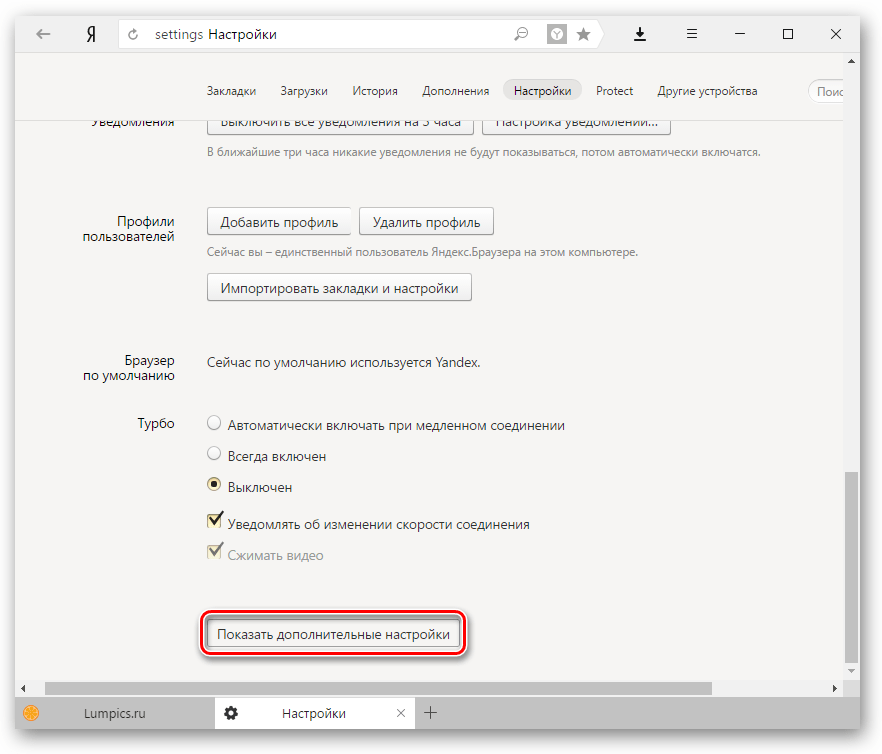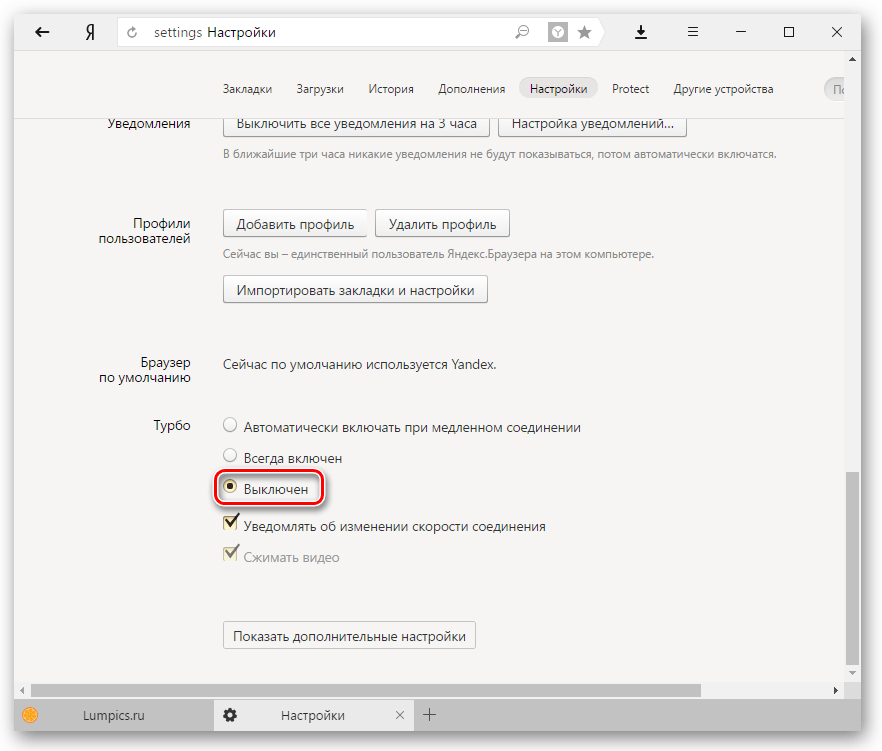 Если Турбо активируется автоматически, как только падает скорость интернет-соединения, то измените этот пункт в настройках браузера.