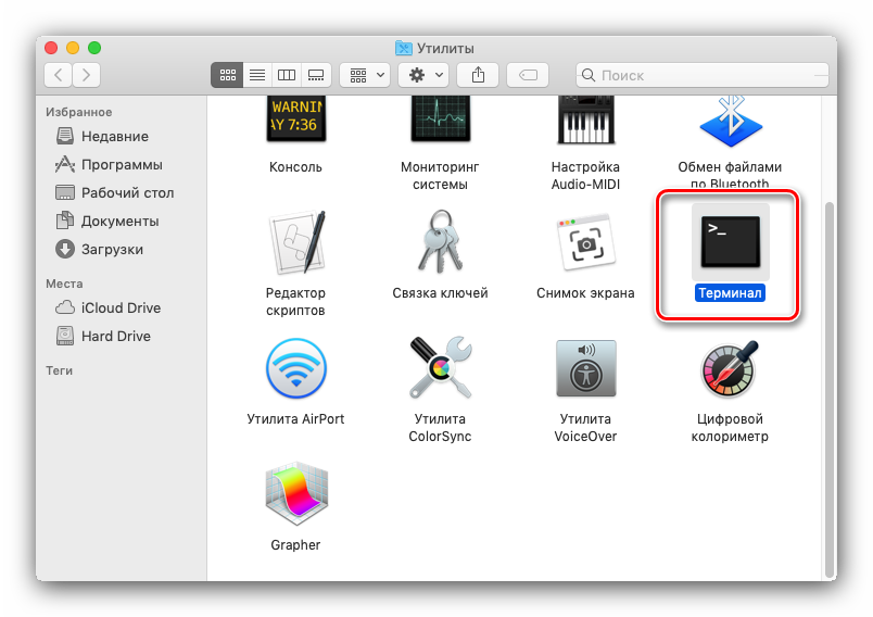 - Запустите приложение «Терминал» – оно расположено в папке «Утилиты».