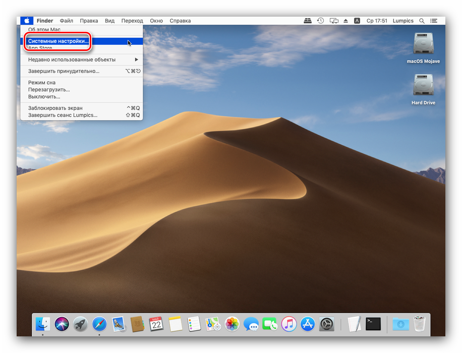 - Переходите к МакБуку. Первым делом откройте «Системные настройки» через меню Apple.