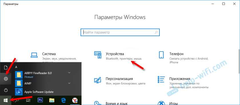 Открываем меню «Пуск» и заходим в «Параметры». Дальше переходим в раздел «Устройства».