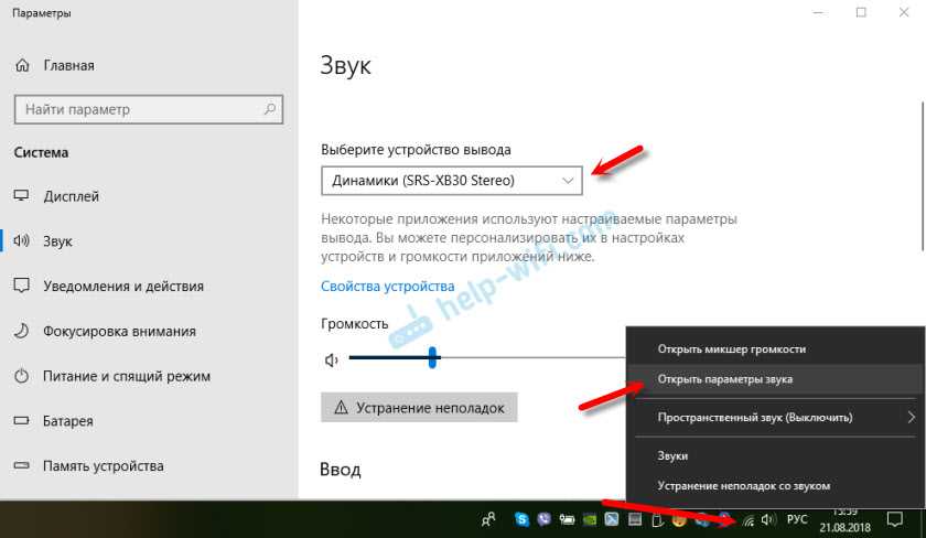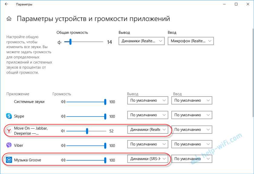 А после недавнего обновления, в Windows 10 появилась возможность выводить звук (и использовать микрофон) на разные источники вывода для разных программ. Настроить эту функцию можно в разделе «Параметры устройств и громкости приложений», в которое можно перейти из окна, которое на скриншоте выше. Там нужно просто выбрать источник вывода звука для конкретного приложения. Например: с проигрывателя выводим звук на беспроводную колонку, а системные звуки на встроенные динамики.