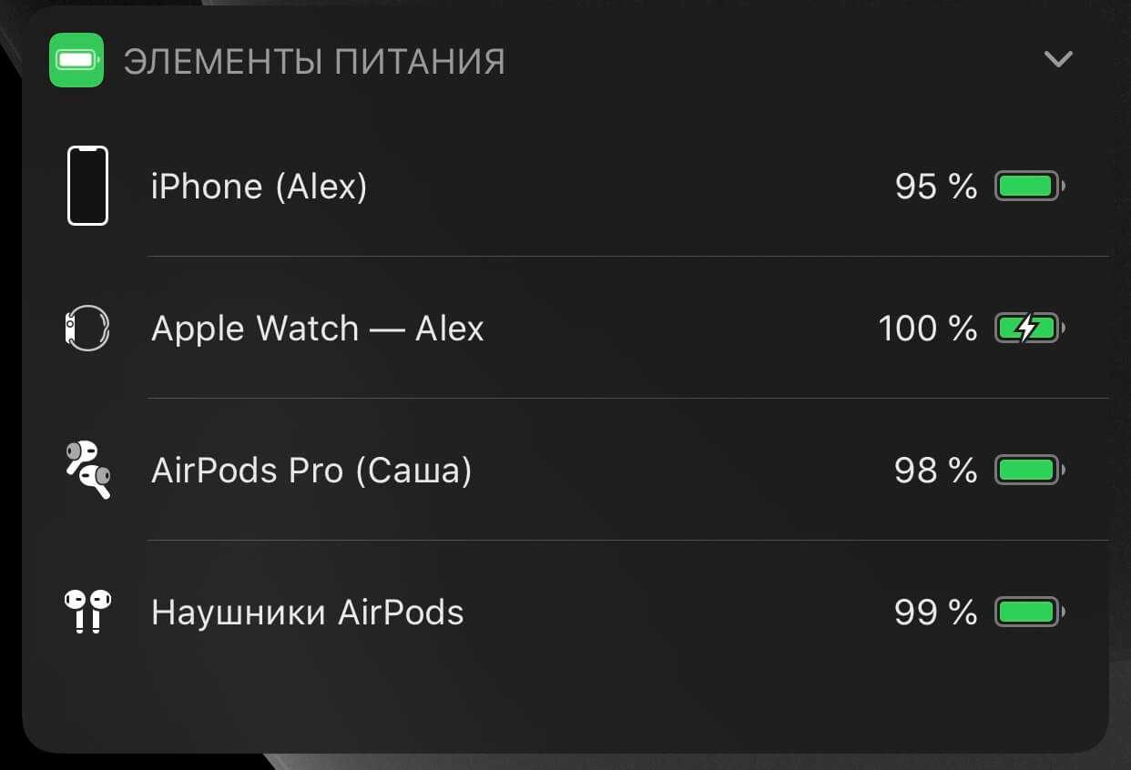 Уровень заряда всех подключенных AirPods вы сможете просмотреть с помощью привычного виджета «Элементы питания» по свайпу вправо.