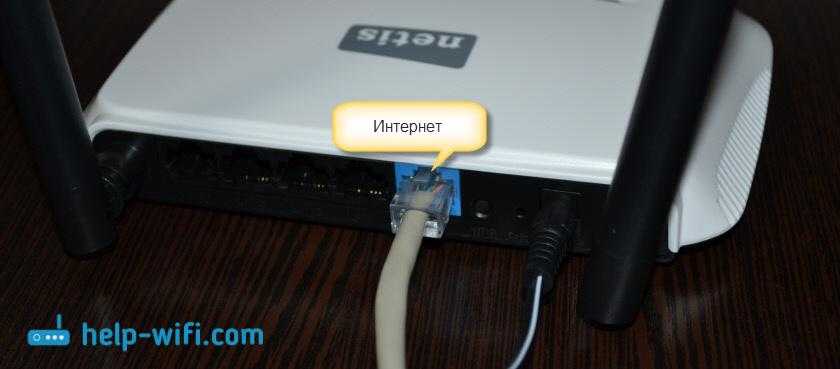 После чего подключите к Netis E1+ интернет по сетевому кабелю от модема, или от интернет розетки (в гостинице, например). Примерно вот так: