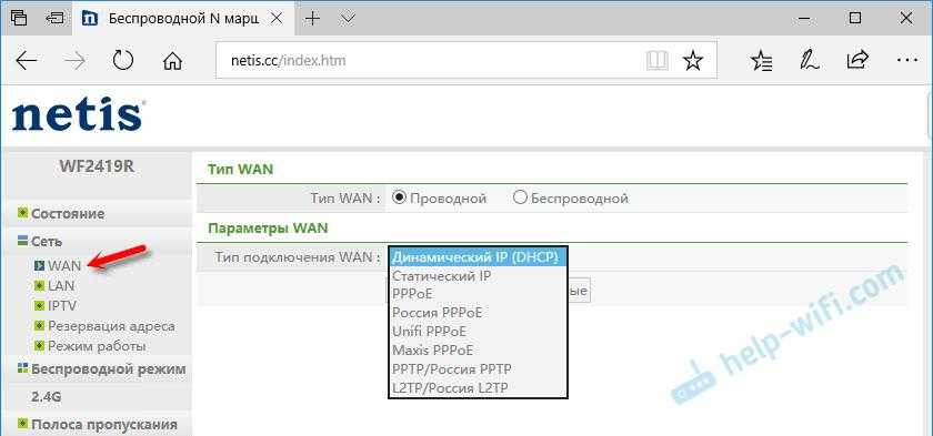 Дальше переходим слева на вкладку Сеть – WAN. Здесь находятся очень важные настройки, если их задать неправильно, то роутер Netis WF2411 не сможет подключится к интернету и раздавать его. Какой тип подключения использует ваш интернет провайдер, вам нужно уточнять у самого провайдера. Это может быть: Динамический IP, Статический IP, PPPoE, L2TP, PPTP. Если у вас тип соединение не Динамический IP, то у вас так же должны быть параметры для подключения: имя пользователя, пароль, и возможно IP адрес. Эти данные выдает провайдер.