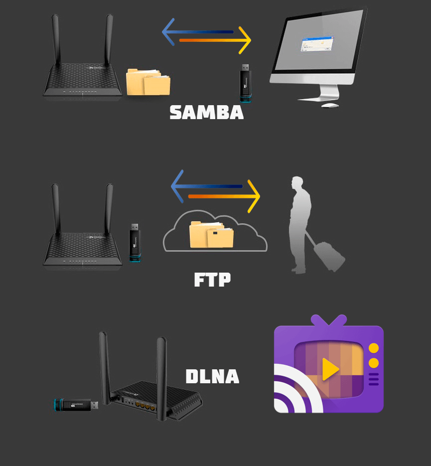 Вторая «фишка» роутера netis N1 AC1200 — это многофункциональный порт USB 2.0, который позволяет использовать его не только в качестве мобильного 3G/4G-маршрутизатора, но и как файловый сервер, подключив к нему большую флешку или внешний жесткий диск объёмом до 2 ТБ. При этом можно организовать не только простенький файловый сервер в локальной сети, но и работать с файлами удалённо из любой точки мира по средствам протокола FTP. Так же есть и встроенный мультимедиа-сервер. Средняя скорость работы с диском — 15-18 Мегабайт в секунду. Больше выжать не получается ввиду максимальной загрузки процессора. Возможно позднее разработчики это исправят и скорость будет ещё выше, хотя, если не гонять по сети террабайты, то и этого вполне хватает.