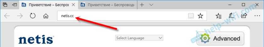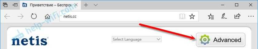 Нужно зайти в настройки роутера. Для этого откройте любой браузер, и перейдите по адресу 192.168.1.1, или http://netis.cc. Можете посмотреть эту подробную инструкцию. Если появится запрос логина и пароля, то укажите их. По умолчанию запрос не появляется, только если вы установили пароль на защиту настроек. Откроется панель управления. Если она у вас на английском, то смените язык, и нажмите на кнопку Advanced.