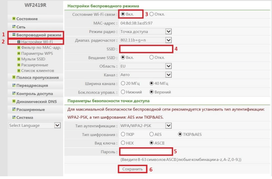 Изменяем состояние беспроводной сети на Вкл. Задаем SSID — Это имя WiFi сети. Остальные параметры заполняем как указано на скриншоте, в конце придумываем пароль от пароль, нажимаем Сохранить. Настройка беспроводной точки доступа выполнена.