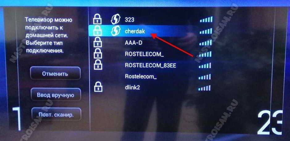 Здесь выбираем первый вариант (может называться «Беспроводное соединение»). Далее, нам нужно начать сканирование доступных подключений. После запуска телевизор начнет поиск сетей и предложит вам список. Здесь необходимо выбрать ваш роутер (название сети, которое вы вводили при настройке маршрутизатора). Если вы не меняли имя роутера, то по умолчанию сеть будет иметь название, отображающее модель устройства, к примеру, TP-Link или Dir-615. Если подключение защищено ключом безопасности, то введите его.