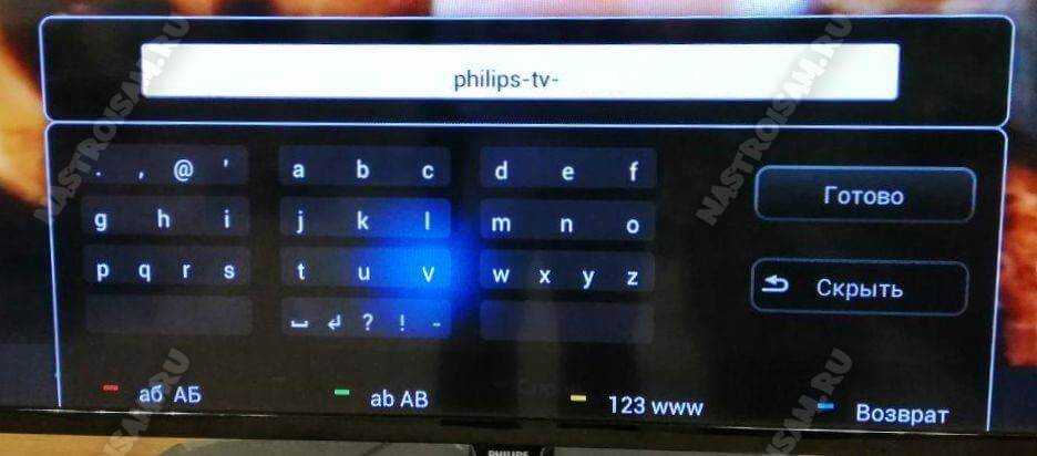 Здесь с помощью экранной клавиатуры введите сетевое имя телевизора и нажмите кнопку «Готово».