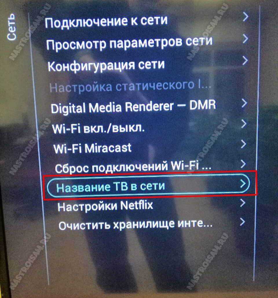 Также советую изменить имя телевизора в сети, чтобы вы могли легко найти его в списке беспроводных клиентов роутера. Для этого перейдите в раздел «Имя телевизора в сети»: