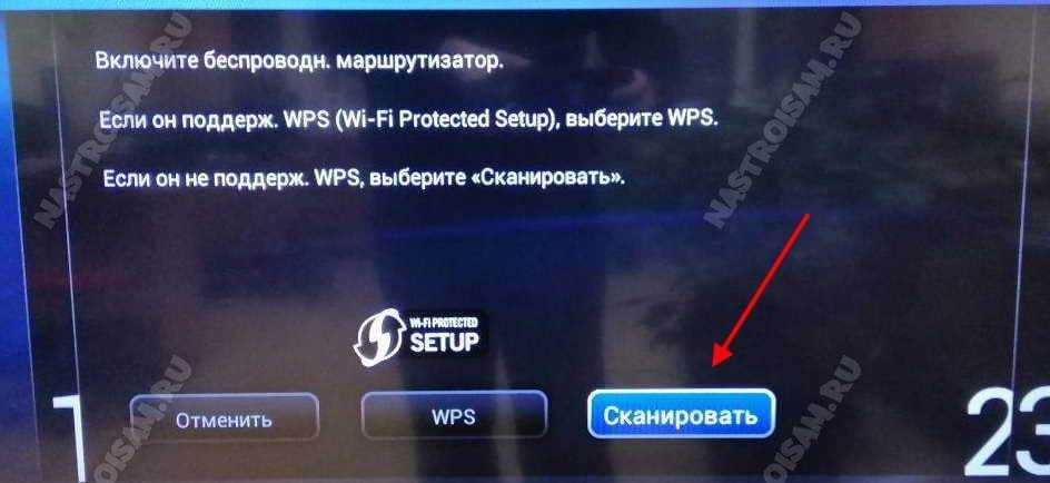 Затем устройство предложит, как мы будем искать сеть роутера, через WPS или сканировать эфир. Лично я предпочитаю не использовать WPS, а потому свой Wi-Fi будем искать самостоятельно — нажимаем кнопку «Сканировать».