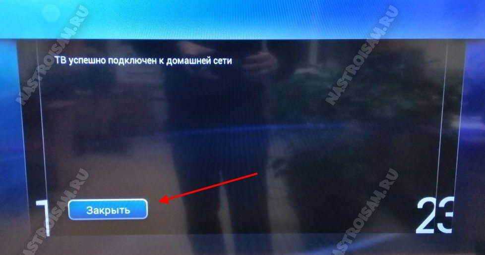 Если пароль Wi-Fi был введен правильно, вы увидите сообщение об успешном подключении телевизора к роутеру. Нажмите кнопку «Закрыть».