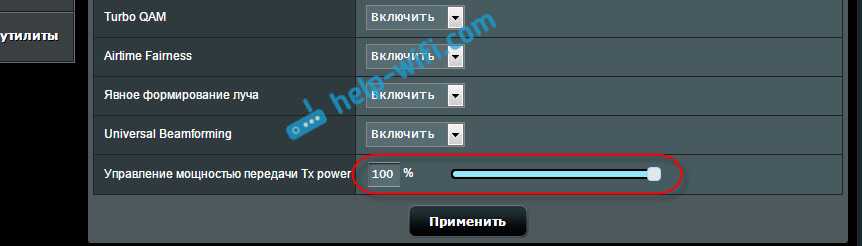 В роутерах Asus, эти настройки меняются на вкладке Беспроводная сеть — Профессионально. В самом низу, есть пункт Управление мощностью передачи Tx power». Там есть шкала, которую можно регулировать в процентах. Выглядит это вот так:
