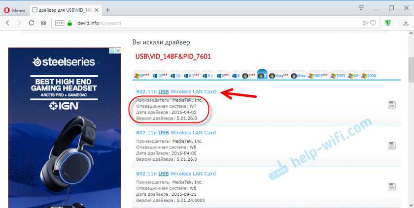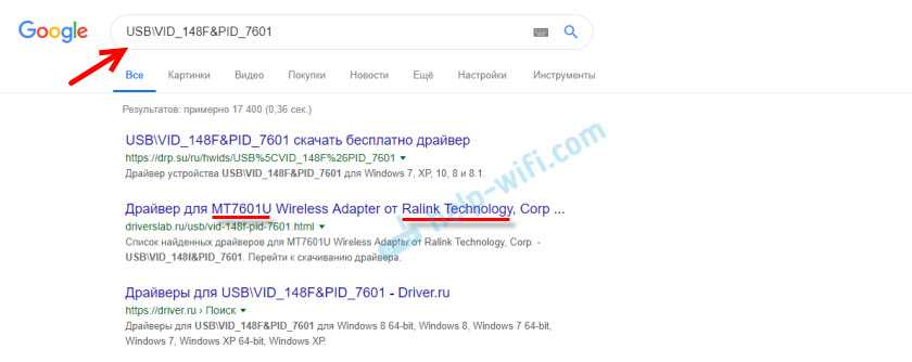 Просто вставляем ИД в Google, или Яндекс и смотрим найденную информацию. Сразу в результатах поиска я уже вижу, что мой адаптер построен на чипе MT7601U от Ralink. Мы знаем производителя, и можем вернутся к загрузке драйвера с официального сайта (ноутбука/адаптера) . Или искать драйвер для чипсета Ralink MT7601U (по модели) .