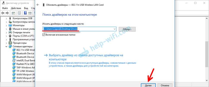 3) Далее указать папку, в которую был извлечен драйвер — после, Windows автоматически найдет его «там» и установит (без вашей доп. помощи ).