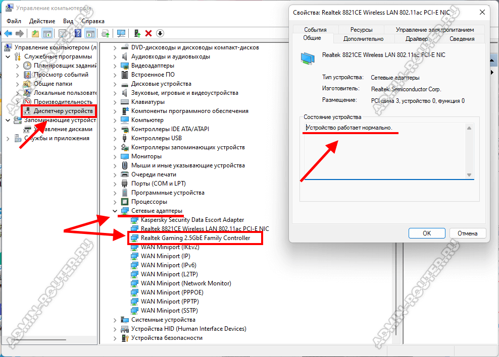 Если же компьютер не видит и кабель провайдера, подключенный к нему кабеля, значит проблема скорее всего с сетевой картой. Начинаем с того, что проверим установлены ли драйвера на сетевой адаптер и как они работают. Открываем диспетчер устройств Windows 11/10, разворачиваем список «Сетевые адаптеры» и находим там кабельный адаптер. Если он встроенный, то скорее всего он будет подписан как 1 GbE или 2.5 GbE. Если адаптер дискретный, то он обычно помечен как 10/100 Fast Ethernet. На значке не должно быть восклицательных знаков, обозначающих проблему с устройством.