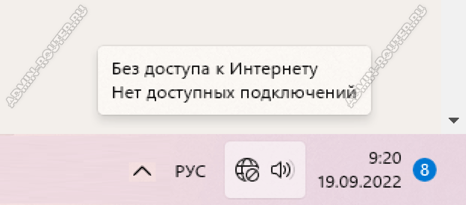 В таком положении дел, при подключении сетевого кабеля к ПК, не проявляется никакой реакции — нет сообщений и нет никакой активности со стороны компьютера. При этом операционная система всем своим видом показывает, что не видит сети. В зависимости от версии Windows, Вы можете увидеть надпись «Сетевой кабель не подключен», значок сетевых подключений может быть перечеркнут красным. На более новых версиях Windows 10 и Windows 11 в системном трее будет значок в виде глобуса и сообщение «Нет доступных подключений». Все будет смотреться так, как будто кабель совсем не подключен.
