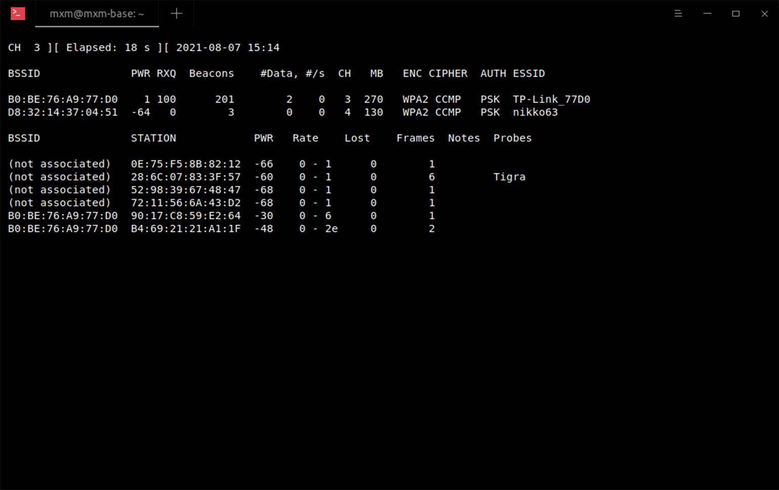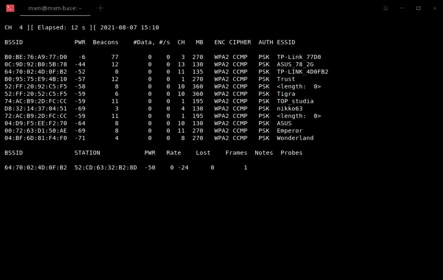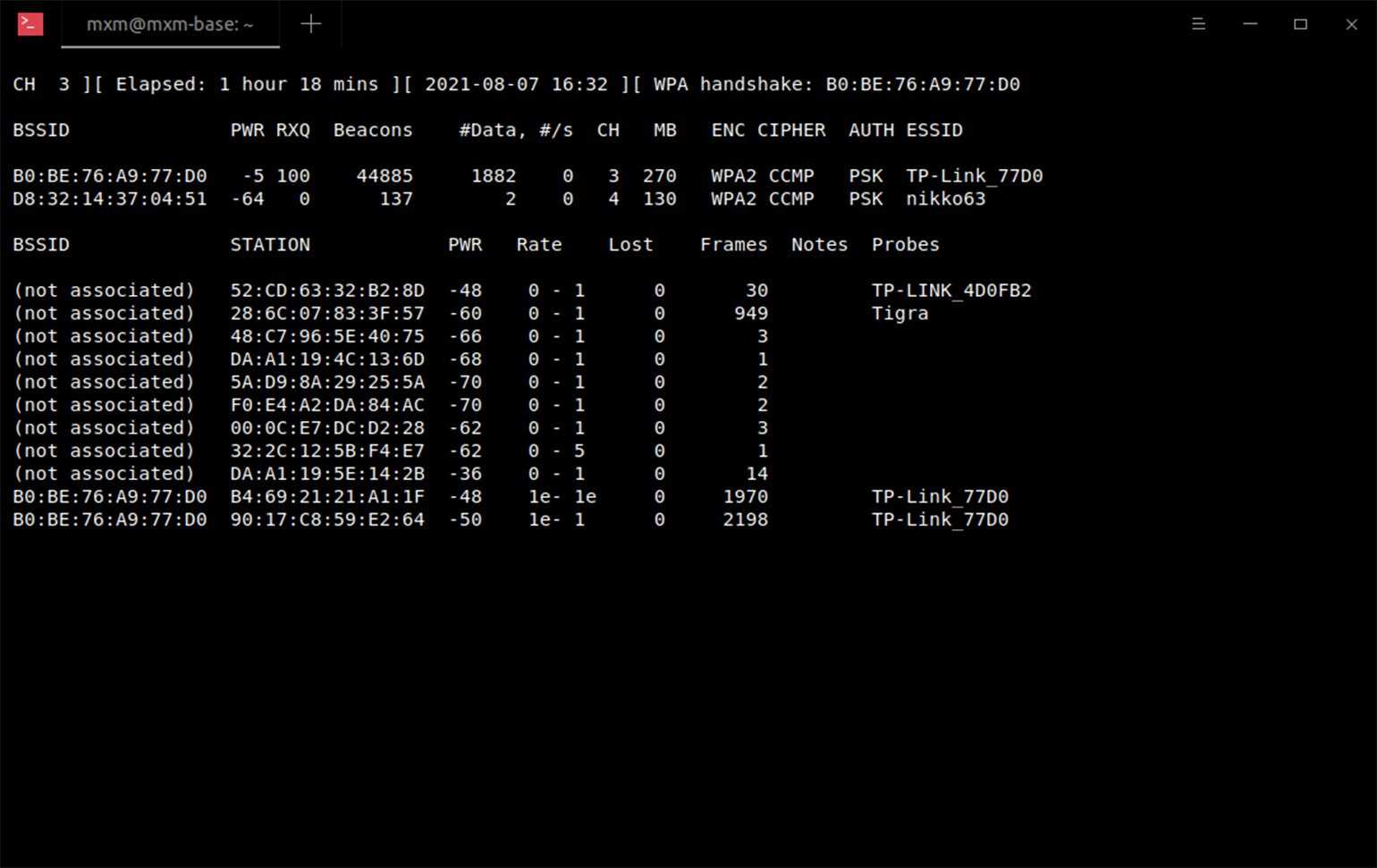 Сверху у нас подробная таблица с точками доступа, а внизу — клиенты. Наша сеть — TP-Link_77D0, из таблицы узнаём её BSSID и CH-канал.