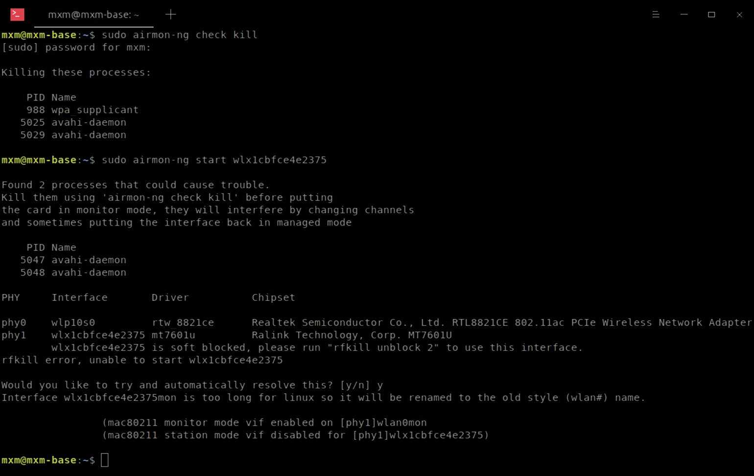 В моём случае найдено два устройства: wlx1cbfce4e2375 — внешний USB-адаптер и Wlp10s0 — встроенный.Чтобы проверить, способно ли устройство участвовать в атаке, нужно узнать его название. Встроенное — Realtek Semiconductor Co., Ltd. RTL8821CE — не поддерживает режим монитора и инъекции. А внешнее Ralink Technology, Corp. MT7601U Wireless Adapter — поддерживает. Его и будем использовать.