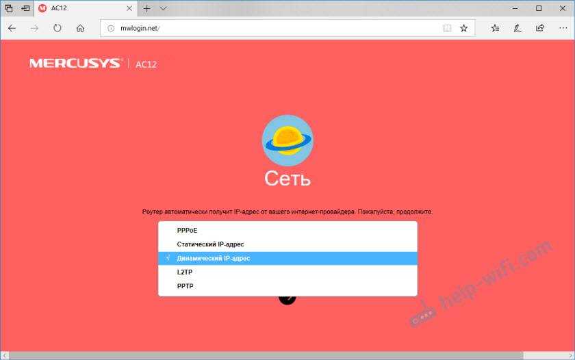 Нужно выбрать тип подключения к интернету, по которому работает ваш интернет-провайдер. Скорее всего, это “Динамический IP”, PPPoE, L2TP, или “Статический IP”. Во всех случаях, кроме “Динамический IP”, нужно задать необходимые параметры. Это логин и пароль, или статические IP-адреса. Эти параметры выдает провайдер.