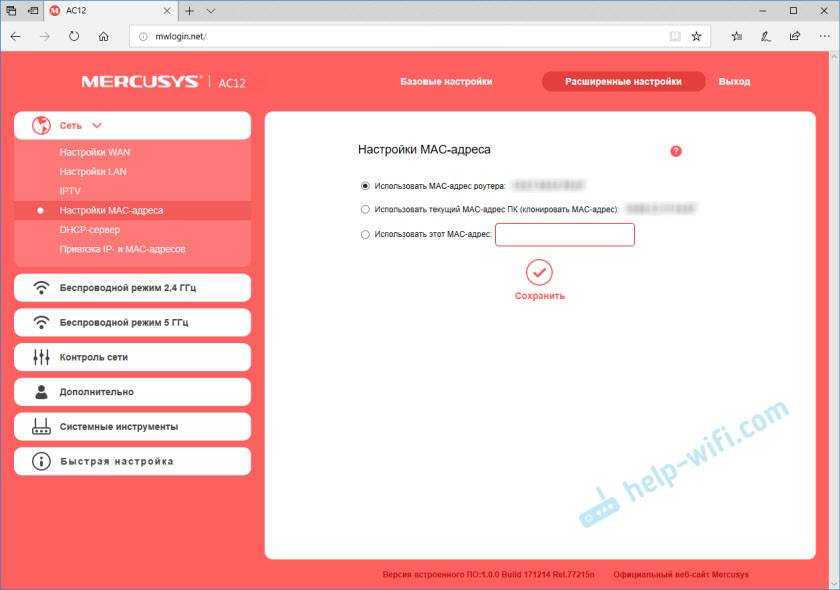 Настройки MAC-адреса. Этот раздел понадобится вам в том случае, когда провайдер делает привязку по MAC-адресу. Можно клонировать MAC-адрес с компьютера (к которому подключены по кабелю), или прописать адрес вручную. Там же можно посмотреть MAC-адрес вашего Mercusys AC12, чтобы при необходимости прописать его у провайдера.