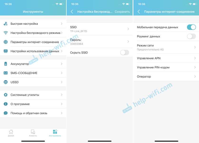 Все основные настройки находятся на вкладке «Инструменты». Первый в списке мастер быстрой настройки. С его помощью можно изменить все основные настройки роутера (пошагово). В разделе «Настройка беспроводного режима» можно сменить имя сети и/или пароль, а так же сделать Wi-Fi сеть скрытой. А в разделе «Параметры интернет соединения» есть возможность отключить мобильную передачу данных, включить передачу данных в роуминге, выбрать режим сети, вручную изменить APN, выполнить необходимые операции с PIN-кодом и выбрать оператора (по умолчанию стоит автоматический выбор). Как я уже писал в начале статьи, TP-Link M7200 автоматически определяет оператора и настраивает подключение к интернету.