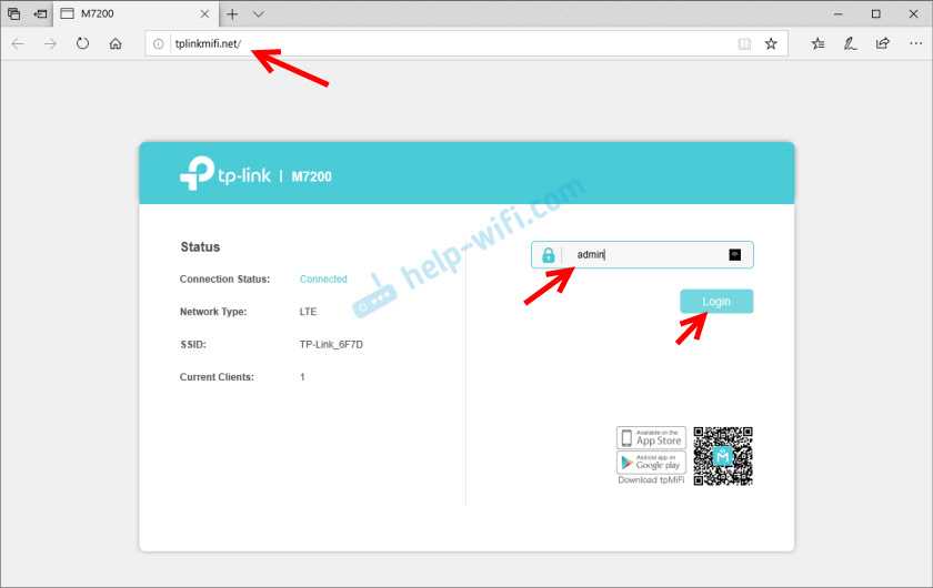 Просто выберите Wi-Fi сеть из писка доступных на своем мобильном устройстве, или компьютере, введите пароль и подключитесь. После подключения с любого устройства, через любой браузер можно зайти в настройки TP-Link M7200. Для этого перейдите по адресу http://tplinkmifi.net. Заводской пароль для входа в настройки — admin.