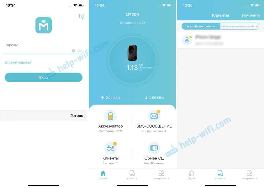 Запустите приложение tpMiFi. Если роутер будет обнаружен, то понадобится ввести пароль администратора роутера. Напомню, что заводской пароль (если вы его не меняли) – admin. На главной странице мы сразу видим информацию об операторе, сети в которой работает роутер, уровню сигнала и использованных данных. Ниже находится информация об аккумуляторе, раздел с SMS-сообщениями, подключенные клиенты и «Обмен СД» (эта модель не поддерживает SD-карты). Так же на нижней панели есть вкладка «Клиенты», где можно посмотреть список подключенных устройств, установить для каждого (нажав на него) лимит на использование данных (мегабайт), задать ограничение на входящую и исходящую скорость.