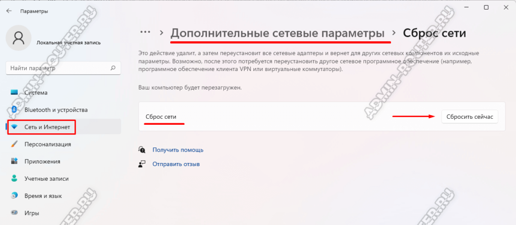 В последнем случае можно попробовать сделать сброс настроек сети. Такая «плюшка» есть в Windows 10 и в Windows 11. Для этого надо зайти в параметры системы, открыть раздел «Сеть и Интернет» ⇒ «Дополнительные сетевые параметры» ⇒ «Сброс сети» и нажать кнопку «Сбросить сеть».
