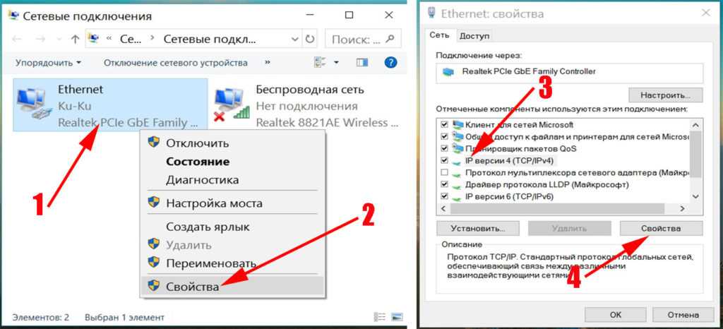 - Откроется окошко с доступными адаптерами данного компьютера. Клацните правой клавишей мыши на значке «Ethernet», «Свойства».