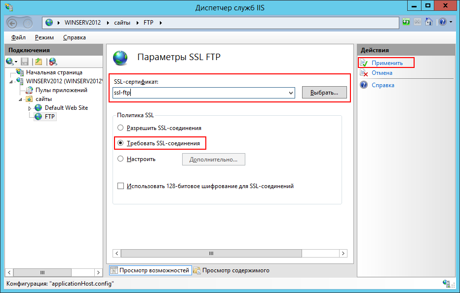 Открывшееся окно предложить сделать выбор политики – укажите второй вариант с требованиями SSL-соединений.