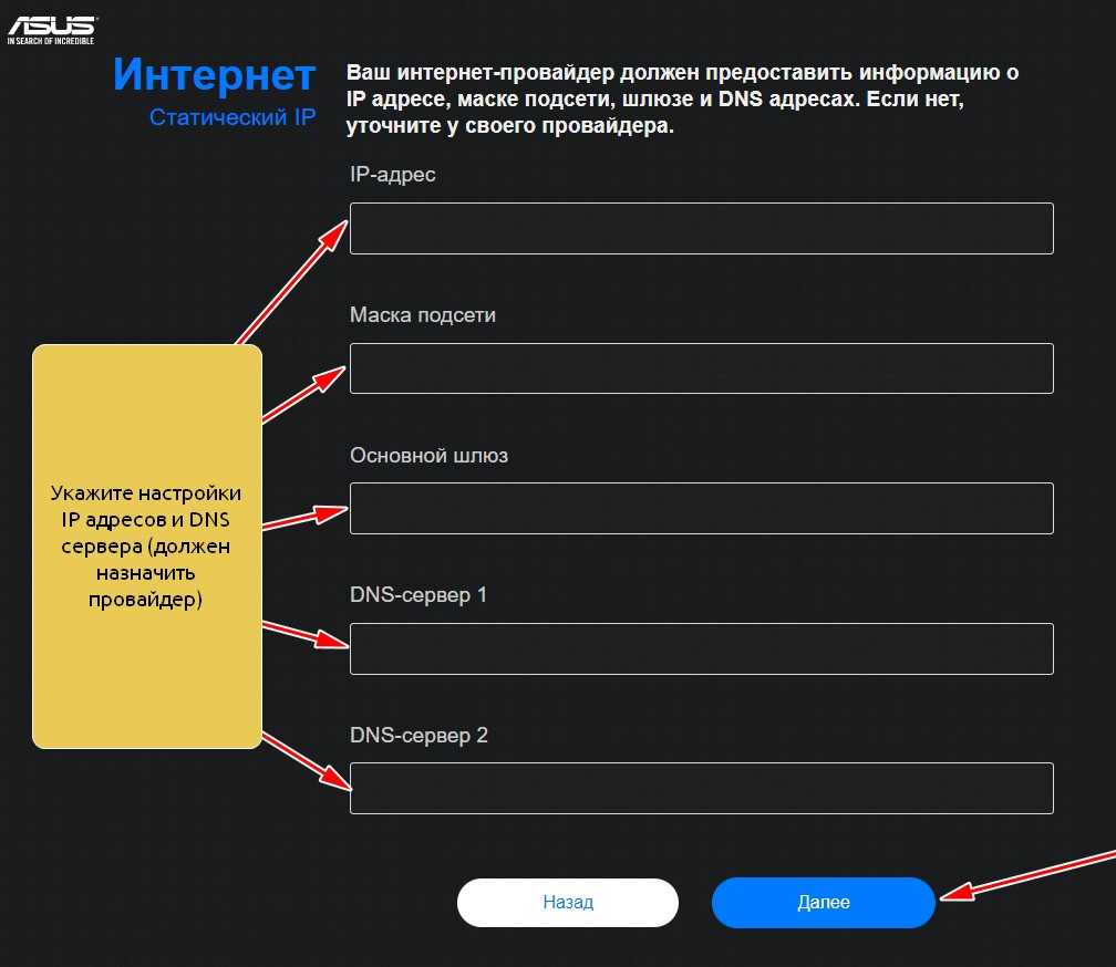 - Впишите необходимые данные, согласно типу подключения (предоставляются поставщиком интернет-услуг).