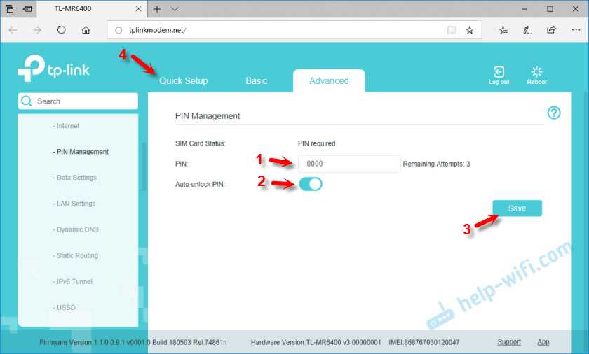 Вводимо PIN-код (зазвичай він зазначений в документації до самій карті) і ставимо перемикач біля «Auto-unlock PIN» щоб роутер надалі сам зміг вводити цей PIN-код. Натискаємо «Save» і повертаємося до швидких налаштувань натиснувши на «Quick Setup».