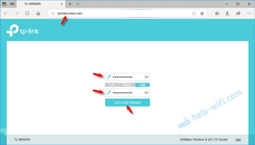 Насамперед потрібно встановити пароль на роутер (цей пароль потрібен для захисту налаштувань роутера). Придумайте пароль і вкажіть його два рази. Обов’язково запишіть пароль, щоб не забути його. Його потрібно буде вводити кожен раз, коли будете заходити в налаштування TL-MR6400.