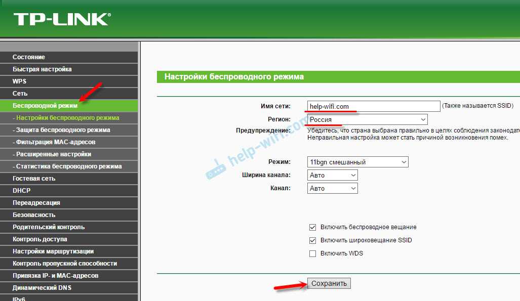 В меню «Беспроводной режим» — «Настройки беспроводного режима». Требуется ввести данные с параметрами «Имя сети» и «регион». Требуется помнить о необходимости сохранить все произведённые действия.
