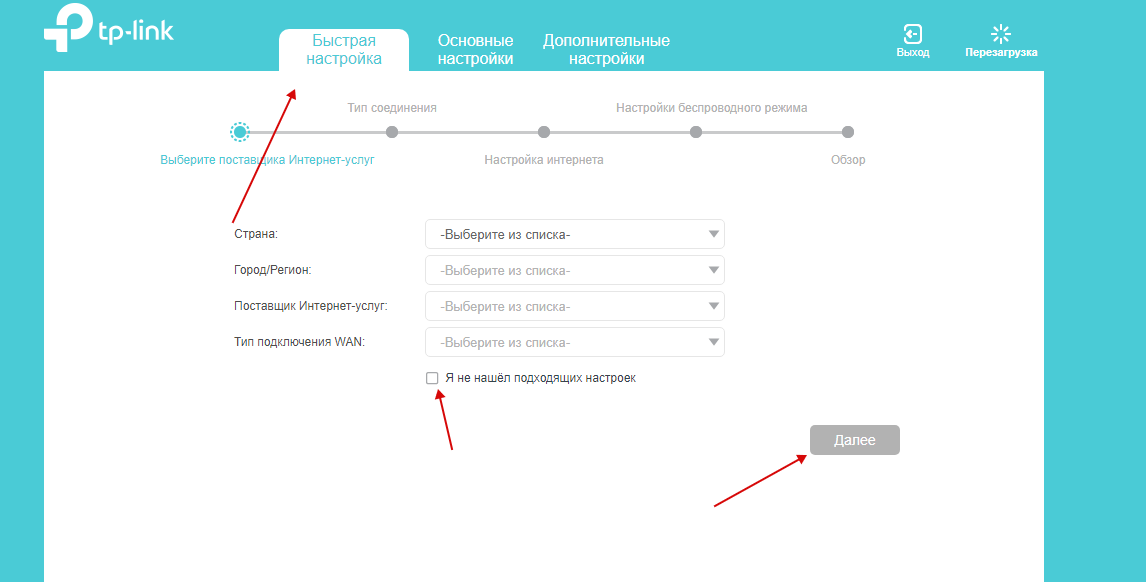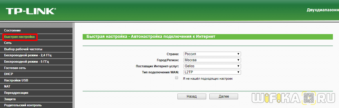 Получилось? Отлично! Переходим в боковом меню в раздел «Быстрая настройка». На первом этапе будем подключать TP-Link Archer C20 к интернету. Для этого в большинстве случаев не понадобится гадать, какой у вас тип подключения, поскольку на простом уровне все провайдеры отсортированы по странам и городам. Нужно только найти своего.