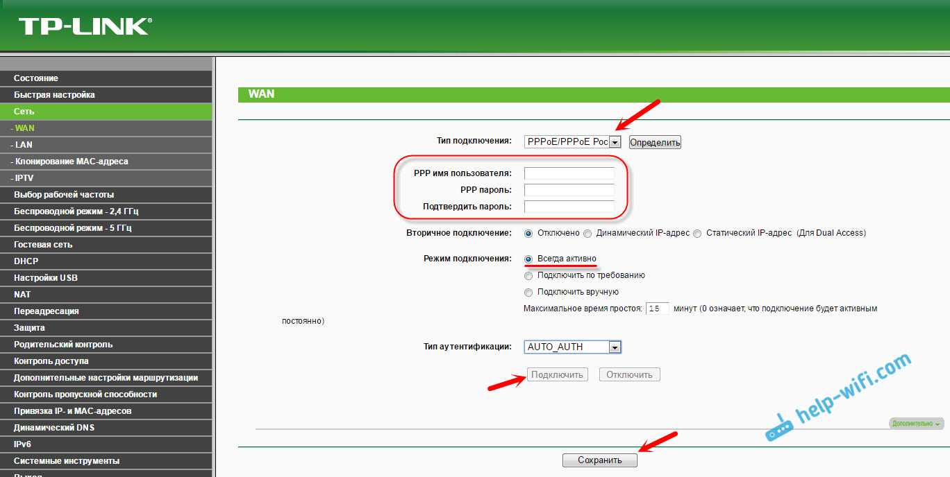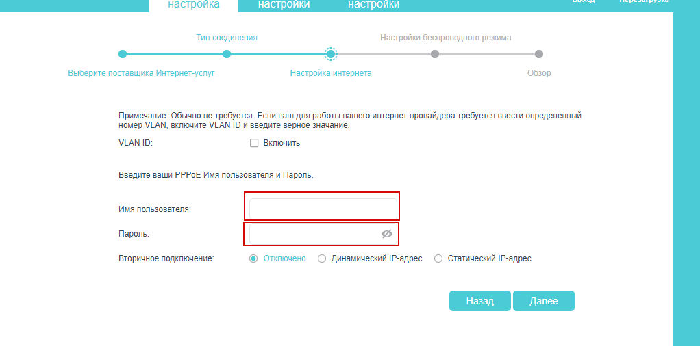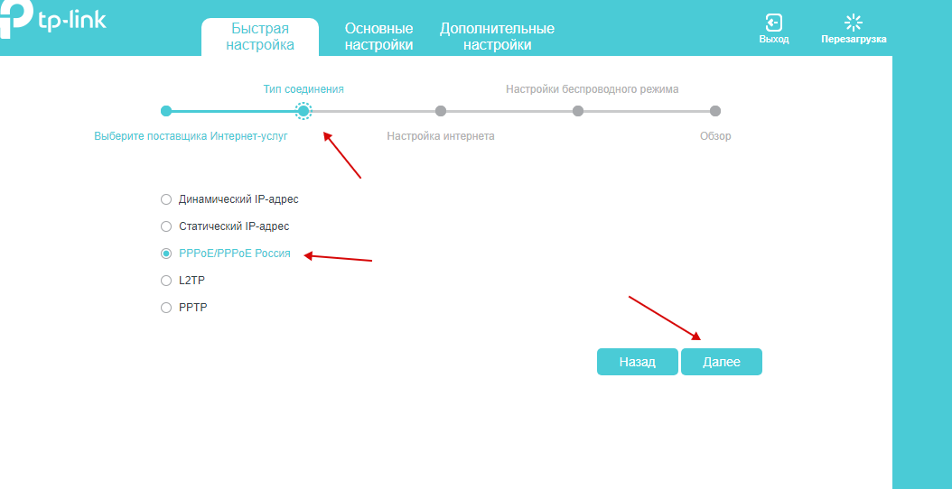 Нужно выделить тот тип подключения, который использует ваш интернет-провайдер (Динамический IP-адрес, Статический IP-адрес, PPPoE, L2TP, PPTP)