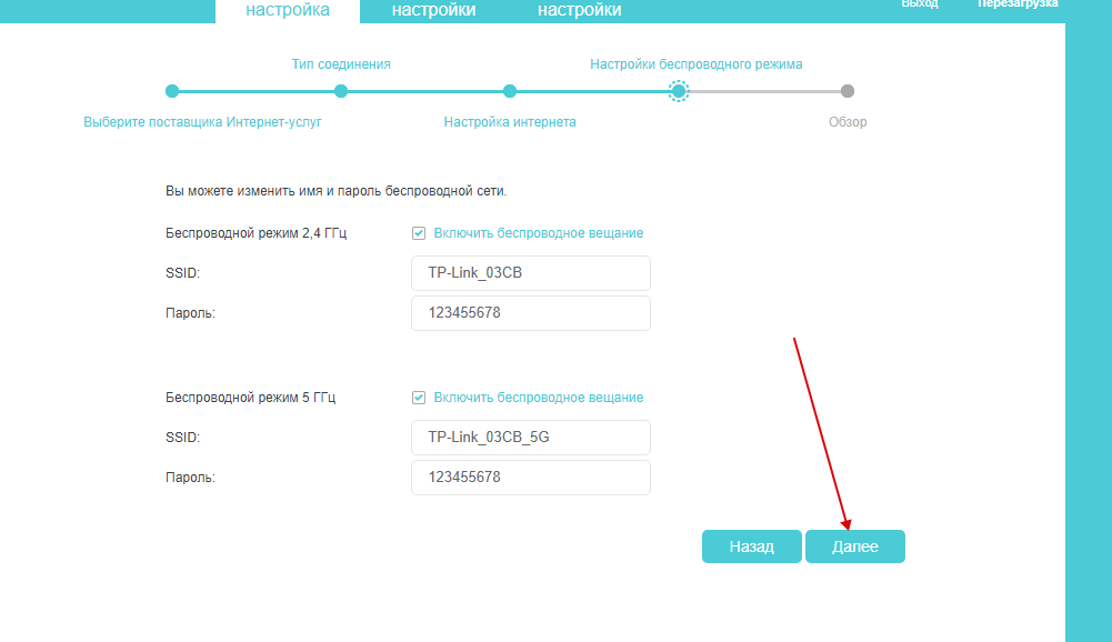 9) В полях «Пароль» нужно ввести пароль от Вашей wi-fi сети на частоте 2,4 и 5 GHz соответственно. В полях «Extended 2,4 GHz SSID» и«Extended 5 GHz SSID» Вы задаете имя wi-fi сети, которую будет раздавать репитер. (Рекомендуем делать разные имена, чтобы точно знать к какой сети подключаетесь.) Нажимаете кнопку «Далее»