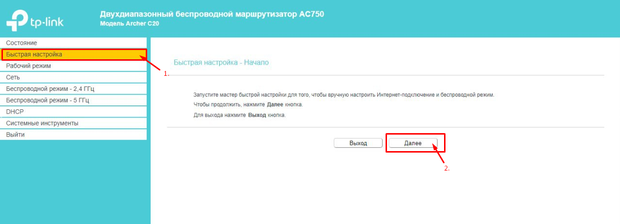 Слева переходим на вкладку «Быстрая настройка», и нажимаем кнопку «Далее».