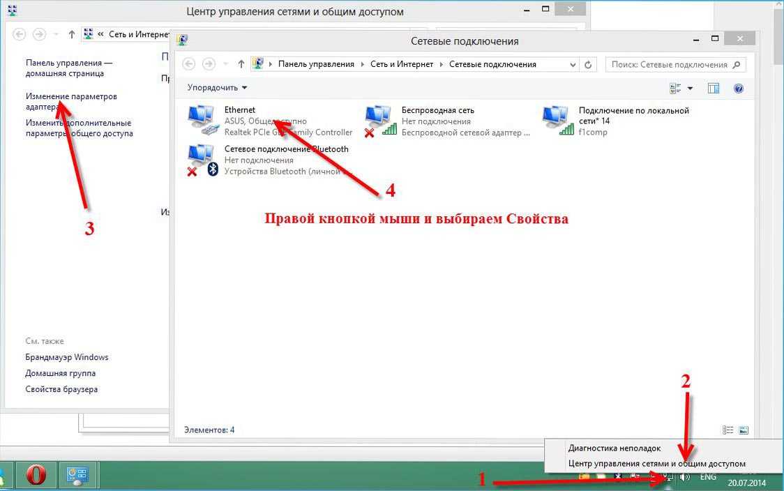 Для реализации первого варианта нажимаем правой клавишей мыши на значок «Сеть». Он расположен в нижнем правом углу, возле даты и времени. Выбираем вторую строчку сверху «Центр управления сетями….».