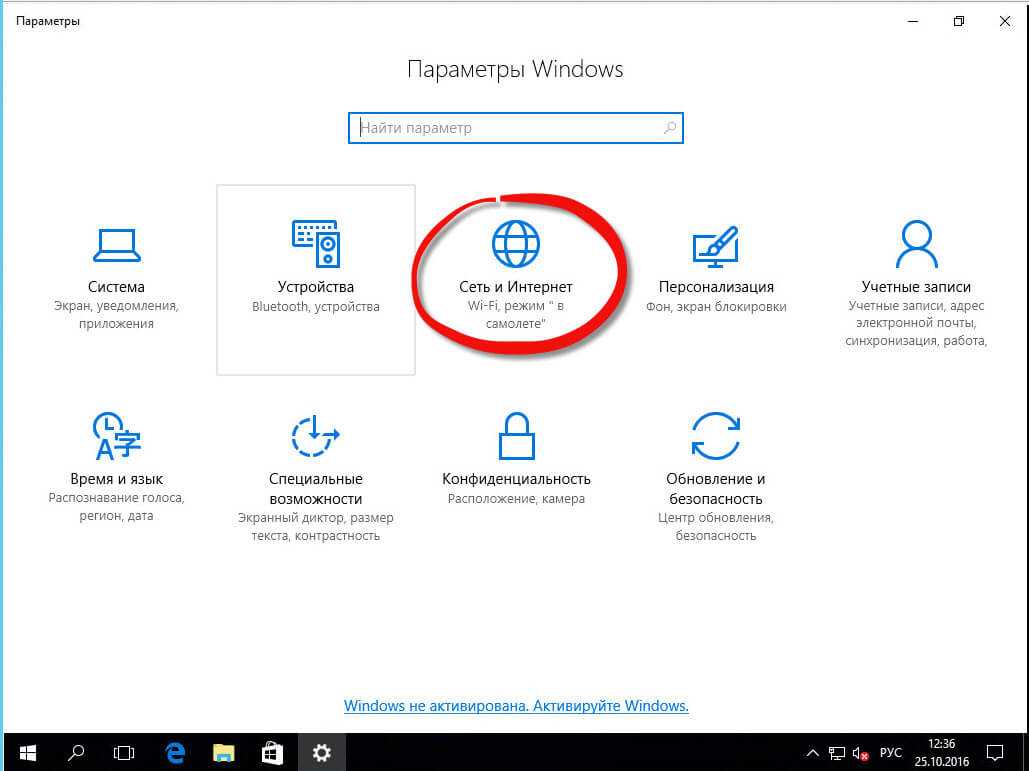 В итоге у вас откроется окно Параметры Windows, его так же можно вызвать сочетанием клавиш WIn+I (это такие горячие сочетания клавиш windows 10). Выбираете пункт Сеть и Интернет.