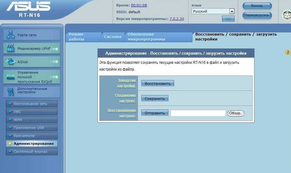 Делается это нажатием кнопки «Восстановить». Дождавшись процесса сброса настроек на заводские, мы повторно входим в веб-морду роутера (на сей раз вводя заводские admin и admin) и переходим на вкладку «Дополнительные настройки — Администрирование — Обновление микропрограммы». Жмем кнопочку «Обзор» и указываем на вышескачанный и распакованный файл прошивки.