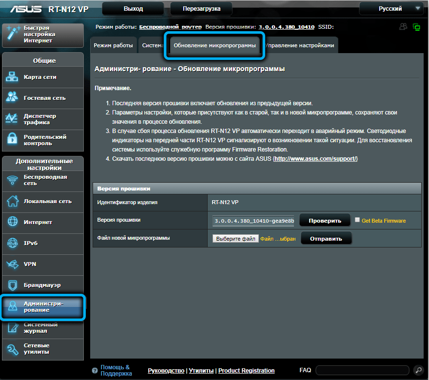 Для начала нужно узнать, какая версия прошивки установлена на вашем устройстве. Для этого заходим во вкладку «дополнительные настройки» и выбираем пункт «Администрирование». Кликаем по вкладке «Обновление микропрограммы» в верхней панели и записываем номер версии прошивки.